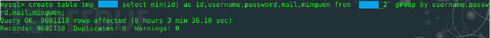 create table tmp_xxx select min(id) as id,mail,password from xxx group by mail,password;
