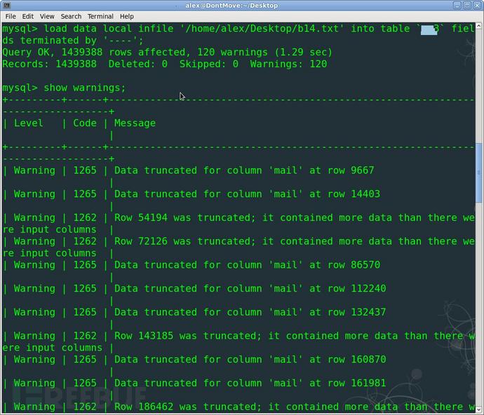 Load data local infile `/home/xx/Desktop/b14.txt' into table `tn` fields terminated by '----';