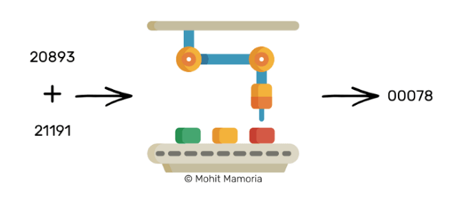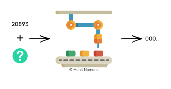 想象一下,我给你两个盒子,第一个盒子里包含了数字20893。然后,我问你,“你能算出这样一个数字吗:如果用它加上第一个盒子里的数字,然后发送给机器,可以得到一个以三个0开头的单词。”