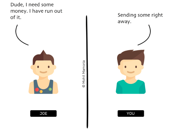 想象一下,你最好的朋友Joe正在国外旅游时候,突然给你打电话说:“我的钱完全花光了,借我点钱。”