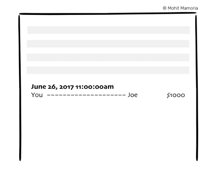 然后,你打电话给你的银行客户经理:“从我的账户转1000美元到Joe的账户。”