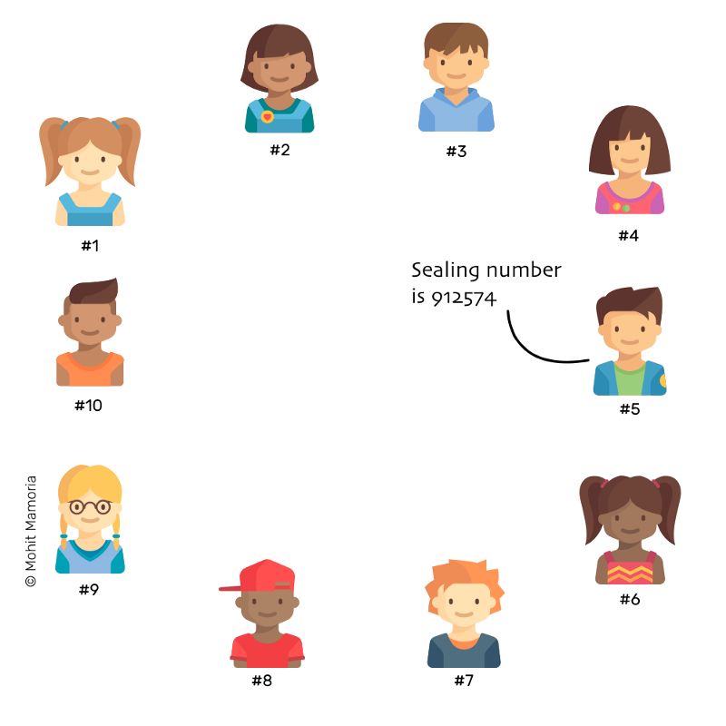 在这种情况下,号码21191成为20893的封印。假设有一个页面的内容是20893。为了加密这个页面(即让人无法改变它的内容),我们在这页上添加一个名为“21191”的封印。 一旦加密数字(即21191)印在页面上,页面就被加密了。
