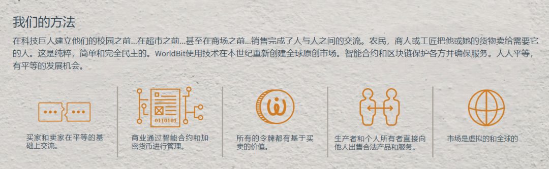 WorldBit是一个在线购物平台(类似于淘宝),利用区块链技术搭建,买家可以与任何地方的工匠、艺术家和小企业进行沟通,切断了买卖交易的中间商。WorldBit使用技术在本世纪重新创建全球原创市场,智能合约和区块链保护各方并确保服务,让人人平等,有平等的发展机会。