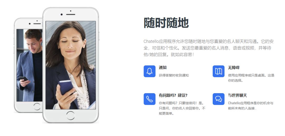 Chatello应用程序允许您随时随地与您喜爱的名人聊天和沟通(类似于微博)。它的安全,可信和个性化。发送您最喜爱的名人消息,语音或视频,并等待他/她的回复。