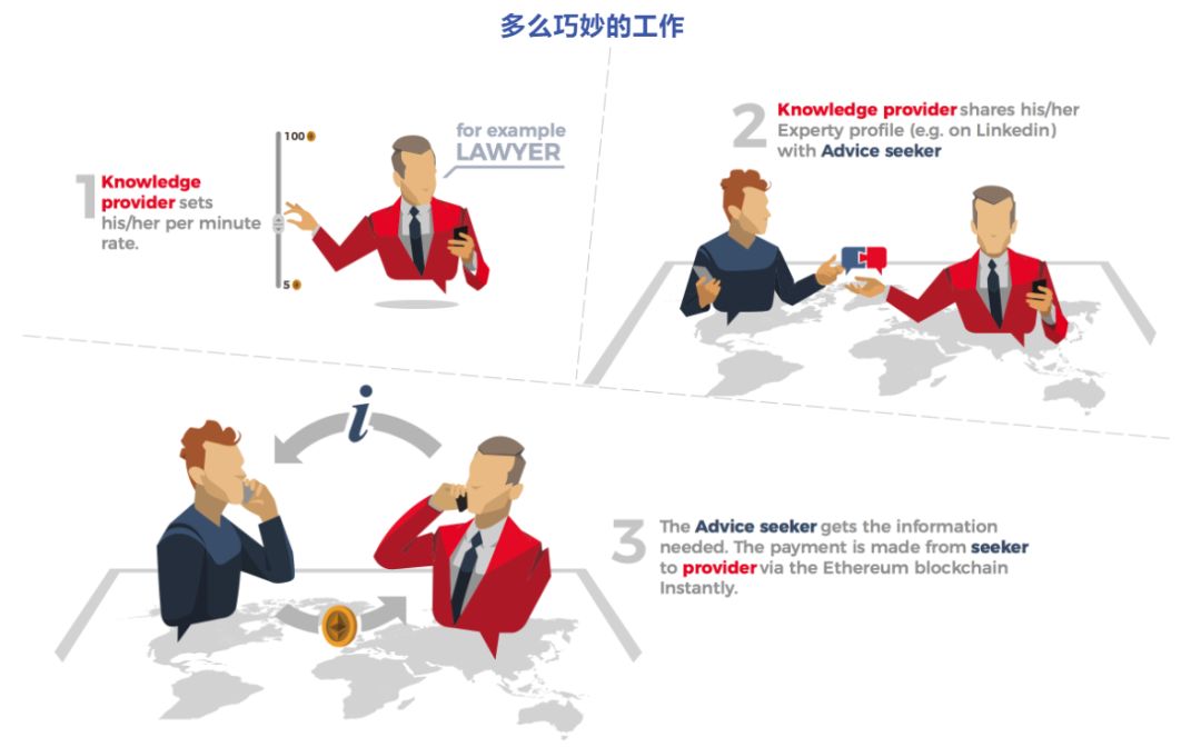 Experty是由加密货币支持的电话咨询通信服务。通过类似Skype的语音和视频方式向专家进行咨询,并根据咨询的时间支付费用。(有些类似于“千聊”、“分答”这样的知识付费平台,但是可以直接向相关人员电话咨询)