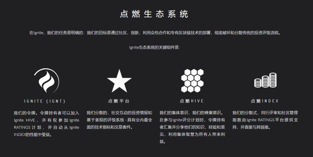 点燃评级是一个ICO和加密货币评级平台,是全球第一个真正的分散和自我调节的投资情报和评级平台,完全遵从众包的意见。IGNITE令牌持有者将通过专有的激励机制参与Ignite评级流程,从而将人群的智慧与被评级的资产的真实绩效联系起来。将通过倾听社区的意见来实现这一点,投资那些纳闷评价最高的嘴馋,并与他们分享我们的收益。ignite软件解决方案将收视率转化为交易信号,自动从ignite自己的投资工具中部署资本,该投资工具由可提供最高评级和性能的数字资产组成,完全依靠ignite RATNINGS社区的意见和智慧。