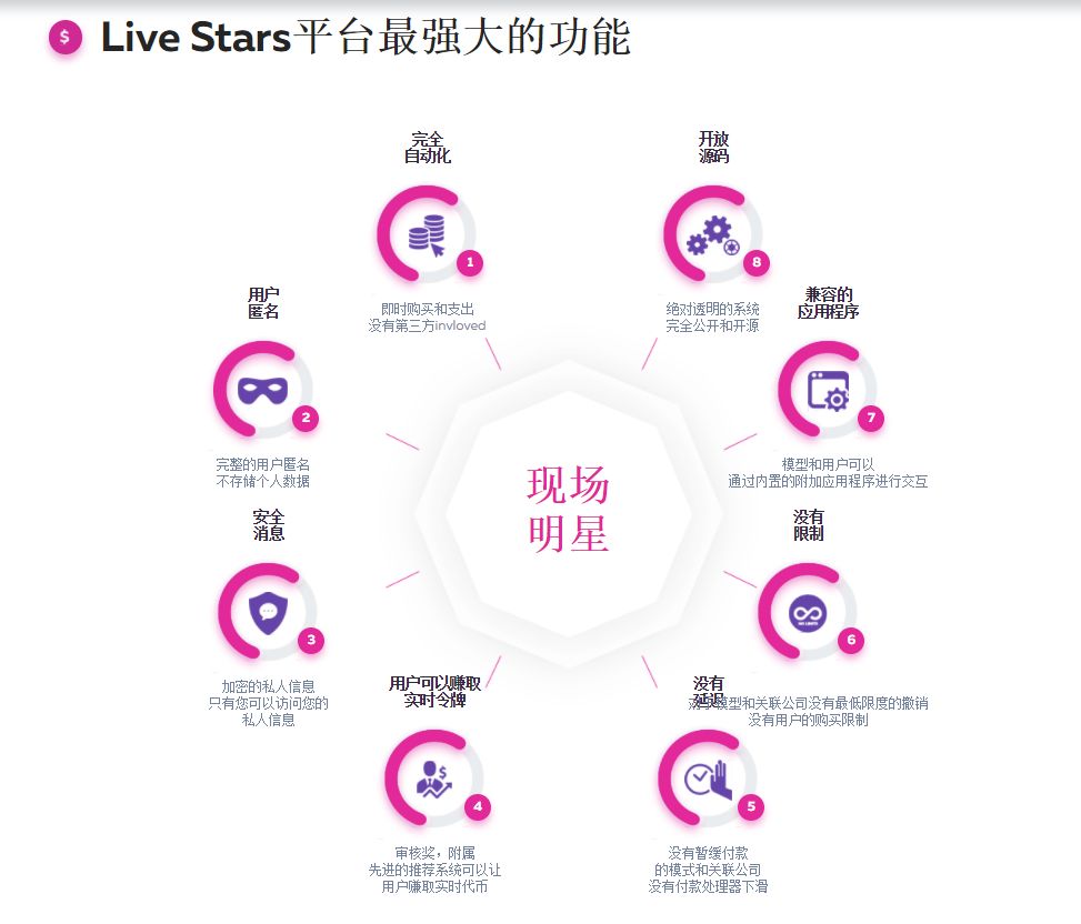 Live Stars是一个基于区块链技术的直播平台,Live Stars正在开发实施区块链技术的新一代网络摄像头平台。该平台具有透明的结构,并针对目前市场上的项目提供了多种优势。我们项目的主要目标是创建一个自动化系统的平台,消除现有的摄像头行业问题,并组织Live Stars项目的工作。