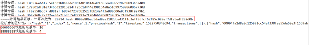 System.out.println("=====计算结果正确,计算次数为:" +nonce+ ",hash:" + hash);