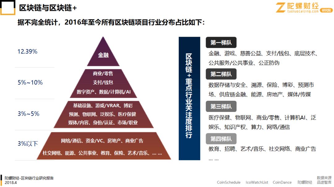 这里看到的是2016年至今我们统计过的区块链项目数据的占比,金融领域这一块是排在第一名,有12.39的项目都是金融相关的区块链项目,结合度非常高。