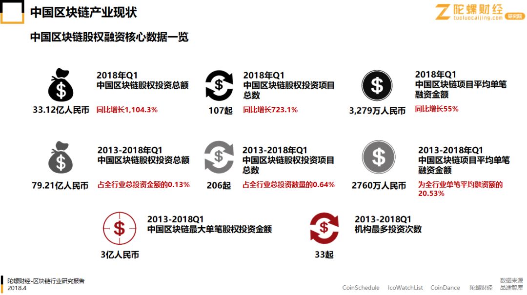 再来看一下国内的数据,因为国内是禁止了ICO的动作(涉嫌非法集资),但是在股权融资市场这一块还是非常火热的,2018年Q1股权融资在平均的融合总额达到了3279万人民币,从这些数据上也可以看出中国的资本对于区块链项目的关注度和投资力度都是非常大的,也是逐年在增长。