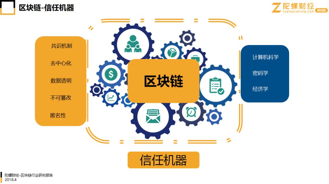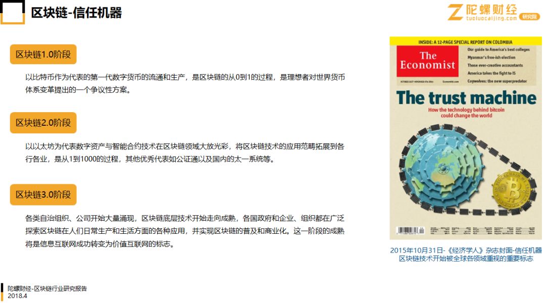 在2015年的时候,在经济学人杂志上就已经提到过说区块链可以作为一个信任机器来解决我们生活中和社会体系中基于信任的问题。比如说我们日常生活中可能需要说我们的传统行业、金融体系、互联网行业。它去建设一个信任的时候,我们需要投入很大的成本包括数据层面、人力、物力。但是基于区块链的话其实它是很简单的,因为不可篡改的特性,可以去掉第三方中介的服务。同时它在传统行业的应用也是非常多的,像在溯源这一块的应用,基于链上的所有的生产流程、工序、原材料,它可以让消费者直观的看到产品的流程。