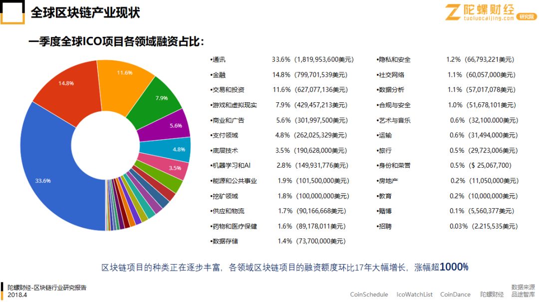 讲到区块链产业这一块的,我们如果说评判一个行业的热度,基本上是从资本的动向这一块进行判断。比如2018年1季度ICO达到了59.6亿美元,环比2017年的第4季度,今年的Q1相比2017年的第4季度增长了2倍多的总额。