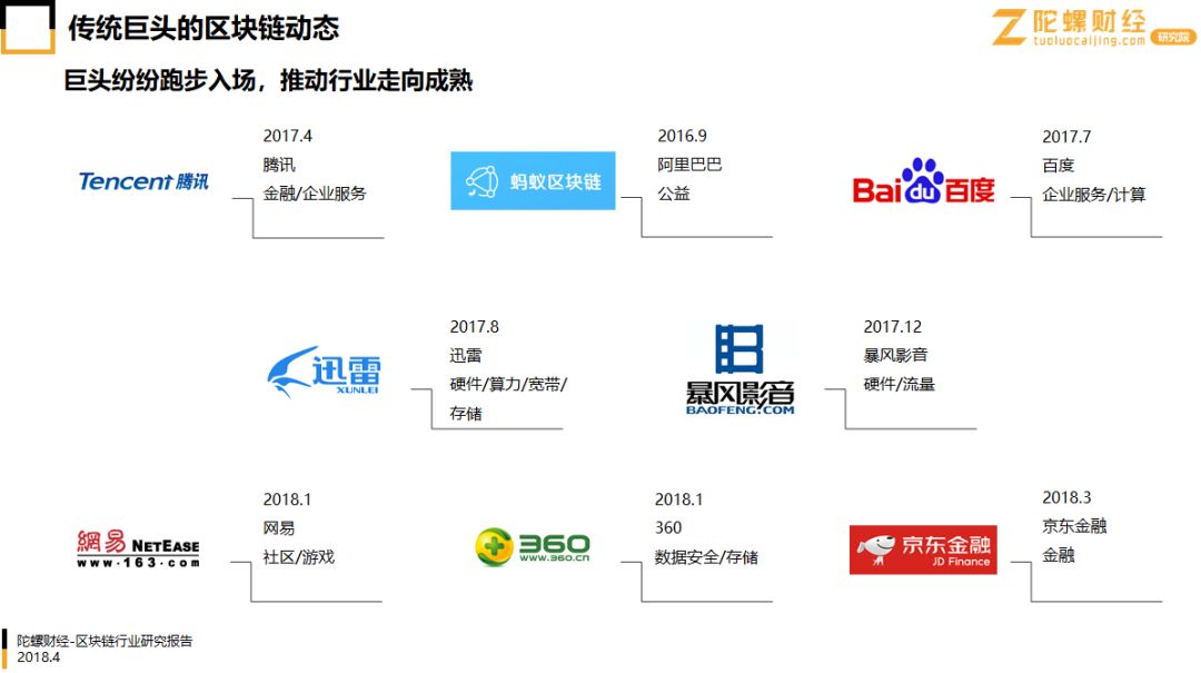 在巨头层面,可以看到不少都纷纷跑步入场,包括最近的华为也有一个白皮书出来。BAT也好,网易、京东也都纷纷进入了区块链,甚至在2015年的时候在国内已经有了一些联盟已经组建起来了。很大一部分,这些巨头关注的点还是在金融、硬件、供应、数据这一块,在其他方面目前是没有去拓展,这也是我们未来新项目上线的机会。