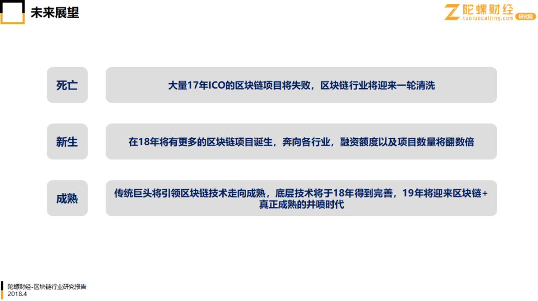 首先我们讲,大家在网上看到区块链项目的死亡率非常高,2017年融资的项目基本上到2018年会死光。死亡潮是会来临的,但是没有想象中的那么悲观和恐怖,因为2017年ICO的项目,其实他们的资质,虽然说搞传销的也有,搞虚假项目的也有,但是真正的项目融到的钱是有很多的,那样一笔钱是可以支撑真正在做事的项目,可以帮助他们完成几年的规划,但那些虚假项目一定会被这个行业淘汰掉。