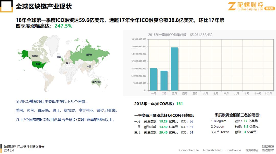 而在全球范围内,区块链ICO的区域是比较集中的,主要诞生在美国、英国、俄罗斯、瑞士、新加坡、澳大利亚、爱沙尼亚。从2018年1季度的数据来看,有一个项目是撑起了30%多的份额,大家都知道这个软件是由俄罗斯团队开发的一个社交软件Telegram,今年1季度的时候募集了17亿美元的资金。