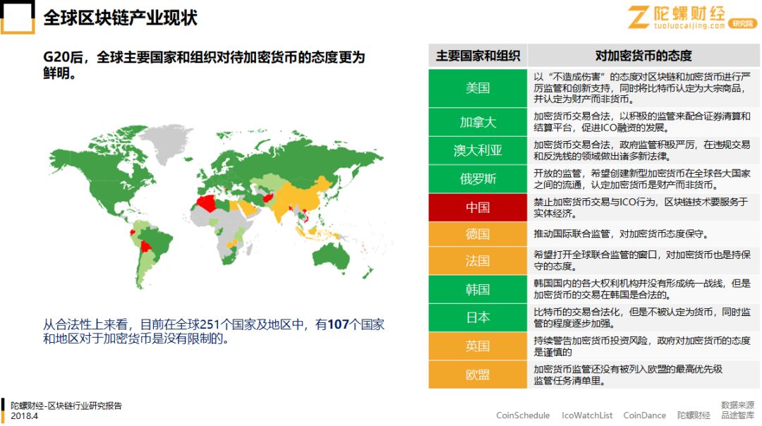 在这里介绍一下区块链2018年1季度产业的现状,2018年1季度G20峰会刚过去,我们看到其实全球非常多的国家对于区块链监管的态度都是比较鲜明的——像美国、加拿大、俄罗斯,除了中国以外其他地区到这些都是偏向于开放的。