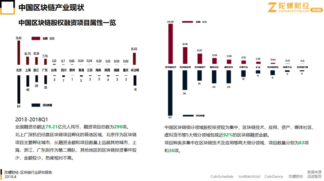 另外要看到的是中国区块链融合项目的一些地方属性和所属的行业属性,我们可以看到中国这一块的区块链的孵化地还是集中于北上广深。