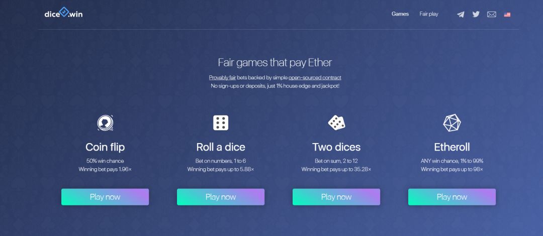 Dice2win对外的宣传推广较少,主页界面也并没有像一般博彩类做的大红大紫使它第一眼看上去具有冲击力,但胜在玩法多样。除了常规的掷骰子猜数字,还加入了猜硬币正反面、猜两个骰子总和的玩法,同时也直接嵌入了Etheroll的玩法。