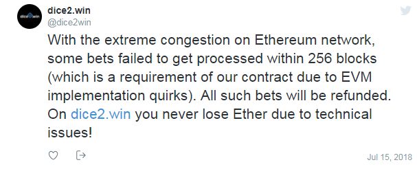 此外,与竞争对手相比,dice2.win下注的交易费用要低得多,甚至支持低至0.01 ETH的投注。更值得一提的是,在及其以太坊交易速度缓慢、很多交易没有确认的情况下,dice2win特意发推说明了此类投注会被退回。