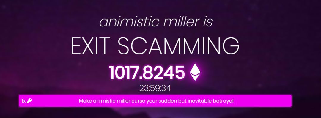 Fomo3D直言自己就是老鼠窝,并声称自己是在进行大型的社会实验。点进Fomo3D官网就可以看到斗大的字眼说“某某人已经离开这场骗局了”。这种方式就是考验着人性贪婪的最佳实证,而现在投入的ETH已经高达1017.82,不也正说明了就算大家都知道这是个骗局,但人们依旧相信自己不是最后一个,并且有机会满载而归或至少不亏本。这也是为什么传销永远存在,因为人性的贪婪永远不会改变。