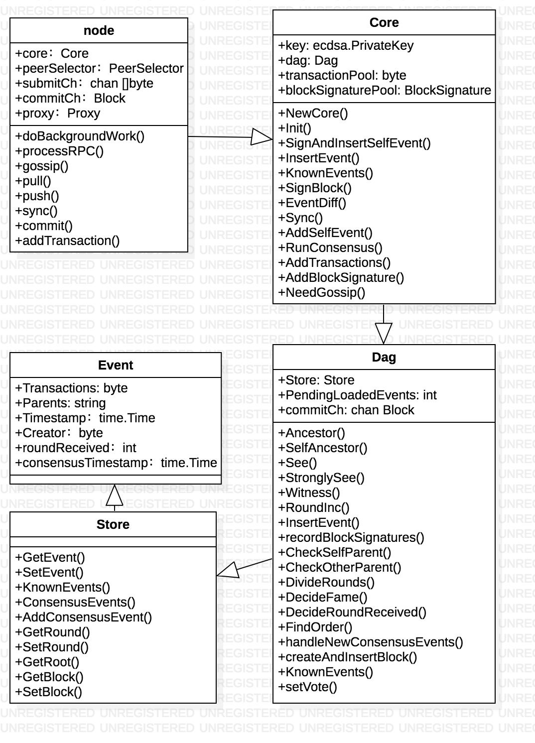 Event是DAG的基本数据结构,前面已经有介绍,Store负责数据的存储和管理,DAG类是DAG共识算法的核心,主要方法实现了可见与强可见的判断,划分round,决定famous witness,决定roundReceived,获取知道的Event,投票。