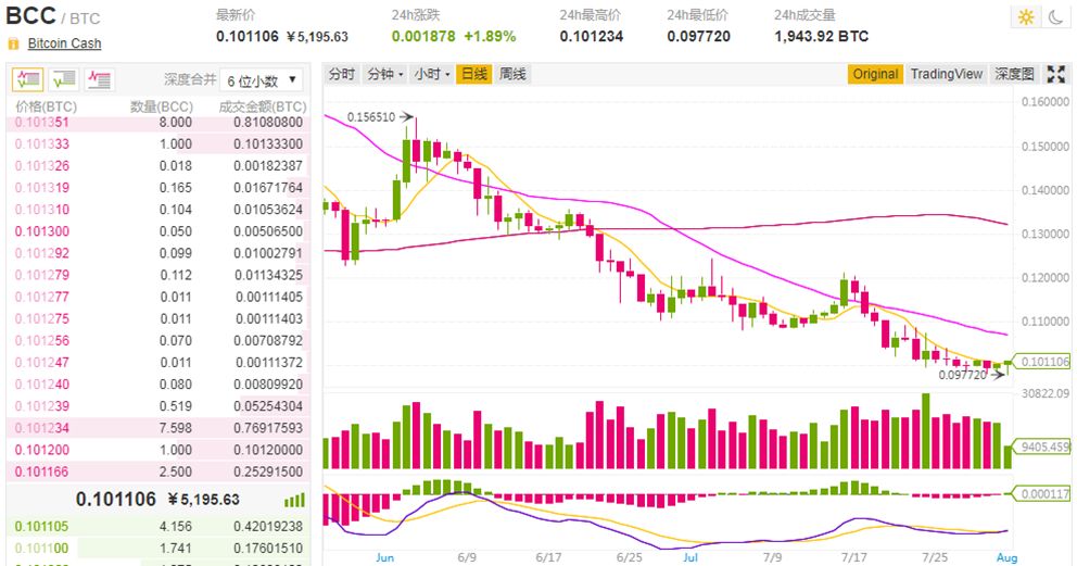 比特币与比特币现金之争不会停止,除非某一方直接归零。如果看谁的价格和市值更高就算胜利的话,根据下面这图,比特币现金只值0.1比特币,比特币现金暂时超越不了比特币。
