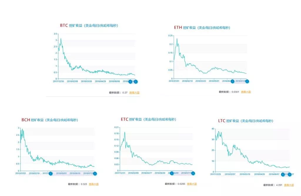 耳朵财经TokenData采集了BTC、ETH、BCH、ETC、LTC这五种主流币在2018年上半年的挖矿收益情况,发现这几种代币的挖矿收益都在不断下降。