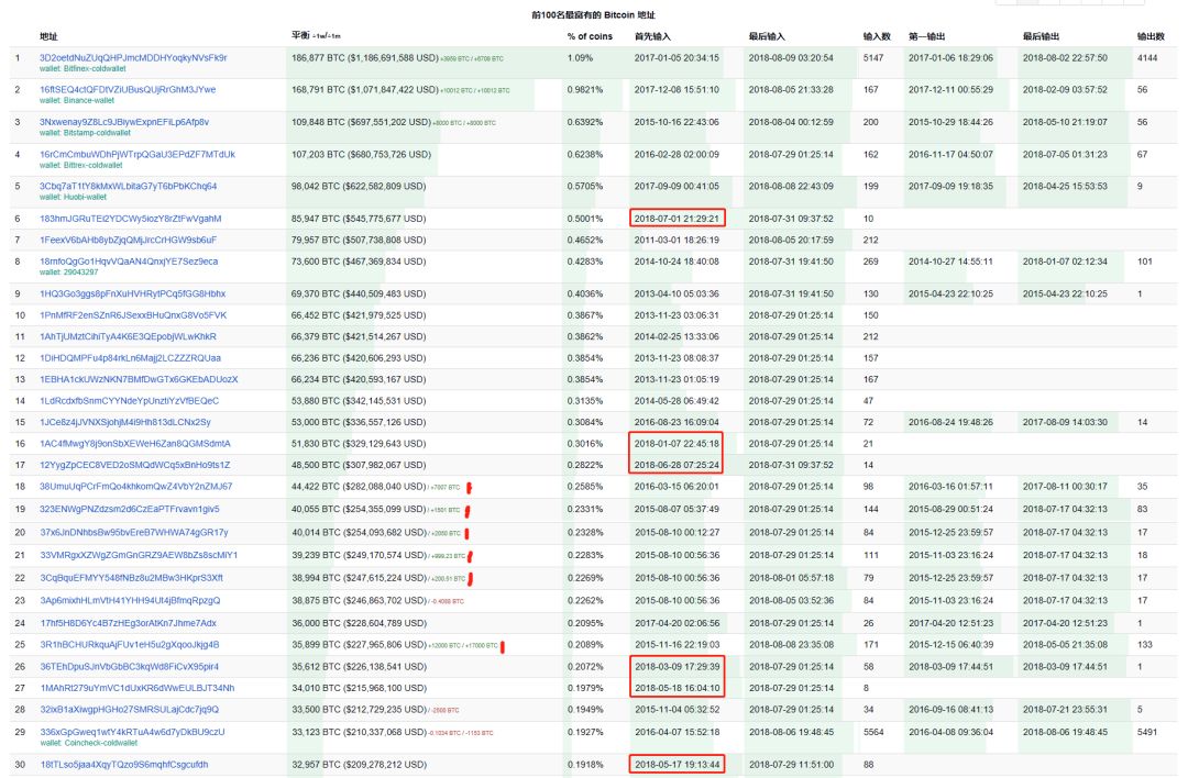 根据比特币前30名的持币情况,TokenData看到有6个大户地址是在今年创建,而且只进不出。