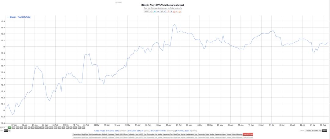 再把目光聚集到BTC身上。虽然BTC价格不断创下新低,但是根据前100名持有量走势不断提升,从2018年初到现在,大户投资者们都在囤积筹码,前100大户占比已经达到了比特币总量的19%!