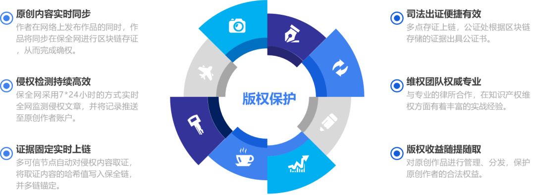 在原创确权、维权环节,日前,保全网推出了原创版权保护模块。通过绑定原创者的创作平台,对其原创内容的数字摘要提取确权上链,保证内容的完整性与原创性,同时还提供侵权监测、证据固定、司法维权一体化等功能服务。
