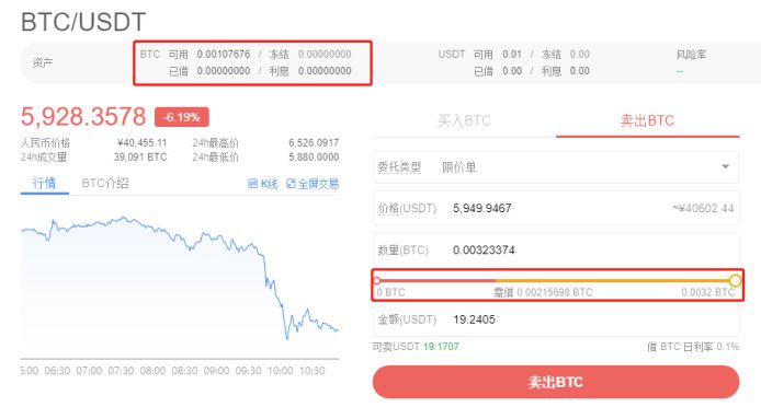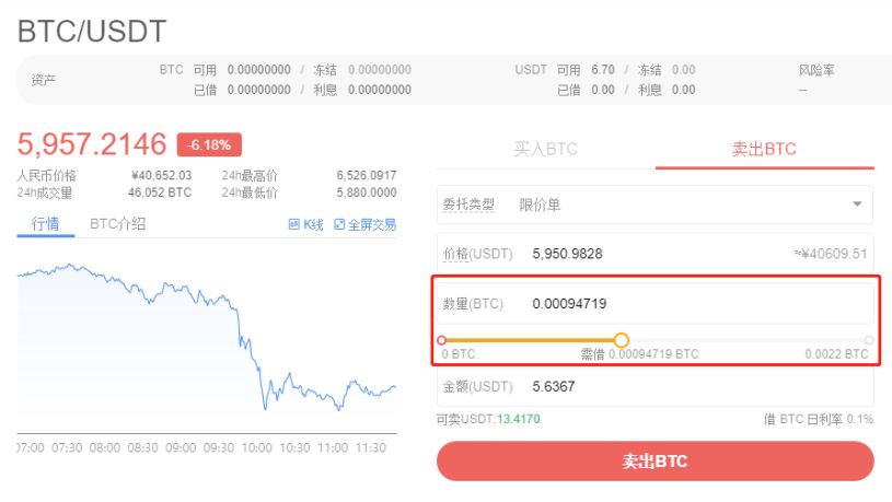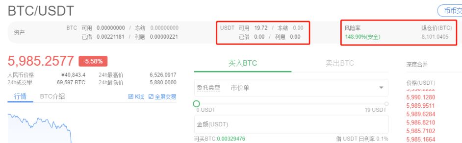 可以看到,虽然账户里并没有BTC,但是依然可以杠杆卖出,而且卖出的BTC美元价值是账户里USDT美元价值的两倍。也就是说,使用了USDT当保证金,卖出了美元价值等同于BTC/USDT交易对“钱包”总市值三倍的BTC。