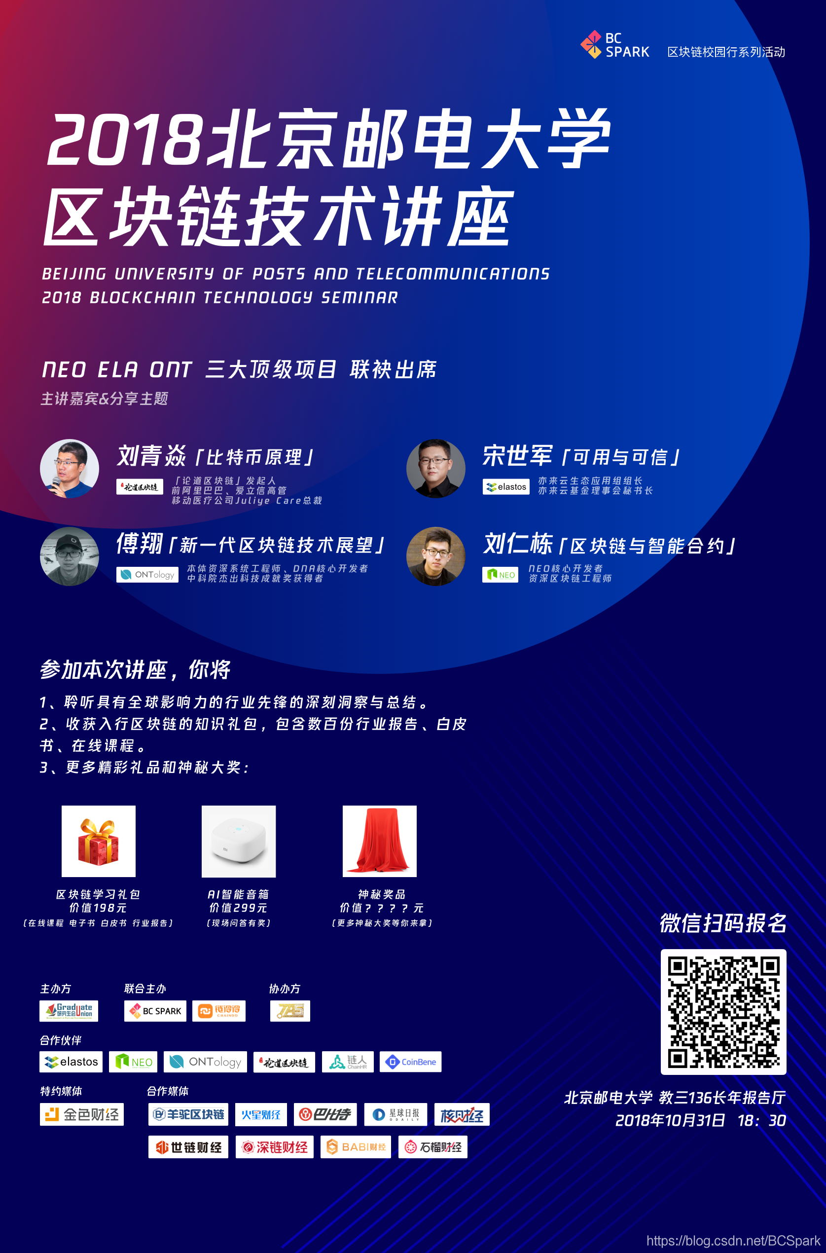 区块链行业对技术研发人员的需求持续升温,与此同时区块链技术人才的培养体系还有待完善。为了加深技术人才对区块链技术的了解和参与度,「北京邮电大学研究生会」联合「BC Spark社区」「链得得」,发起「2018北京邮电大学区块链技术讲座」,为在校学生、开发者普及区块链知识,宣传区块链技术,打开了解区块链理论与行业最新实践的大门,深度参与到优秀区块链开源项目的学习和实践中去,为区块链行业输送新鲜血液。