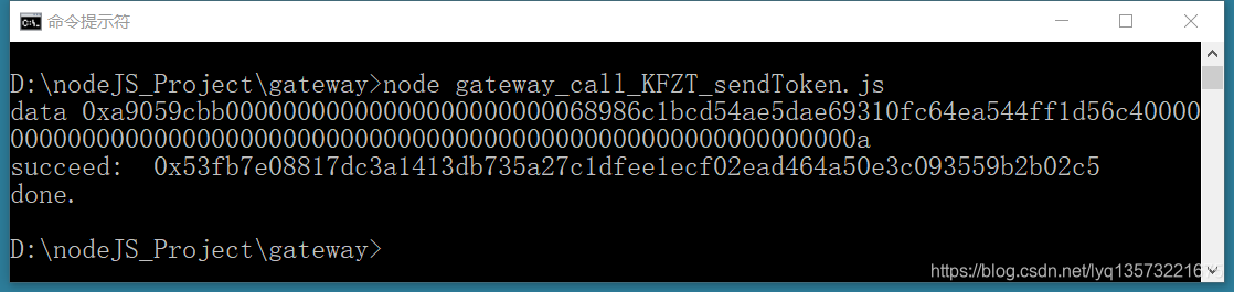 使用gateway节点,node环境运行以下代码,实现对合约的调用,将10个KFZT发回原账号,该调用需要私钥签名。