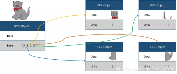 在IPFS中,信息可以存储进IPFS系统中的对象(块)里,这些块可以存储至多256kb的数据,它们还可以链接其他IPFS对象。