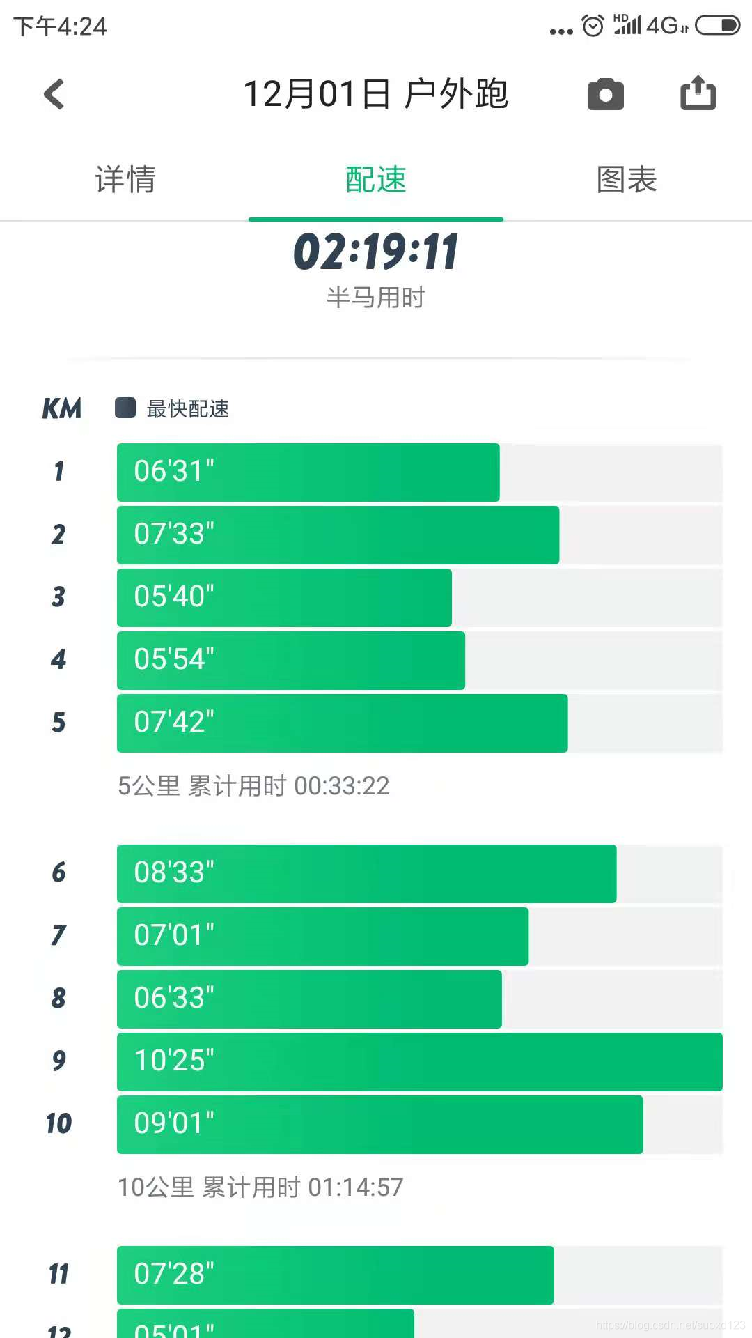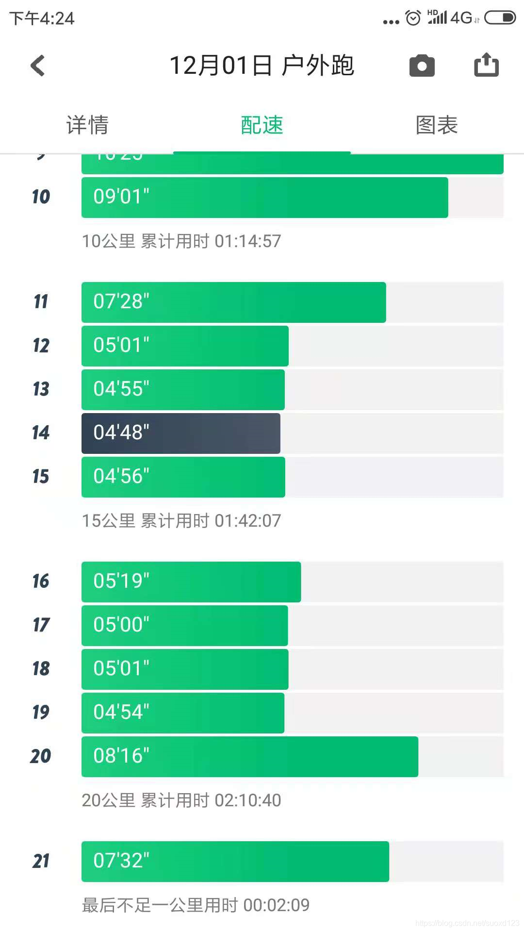 直到走到体育场旁边,在犹豫的时候看到过去的红绿灯刚好是绿灯,我就决定要不过去看看,再跑一会儿,跑不动就回去,结果就到了体育场开始绕圈,然后前面均速在7分钟,而后面10公里均速没超过5分半,而且越跑越欢快,感觉自己有能力跑全马似的,如图所示为每公里耗时。